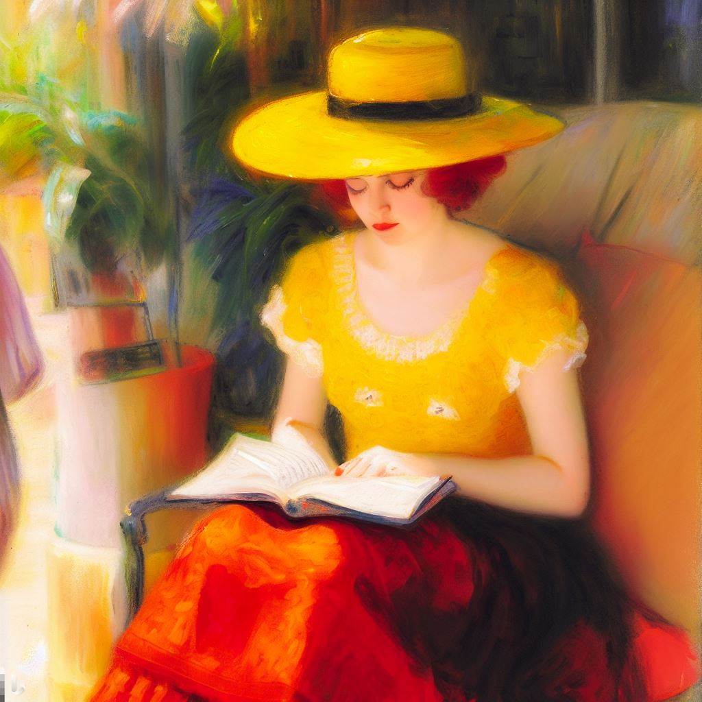 노란 모자에 빨간 치마를 입은 앙드레(독서) - Andrée in Yellow Turban and Red Skirt (Reading)