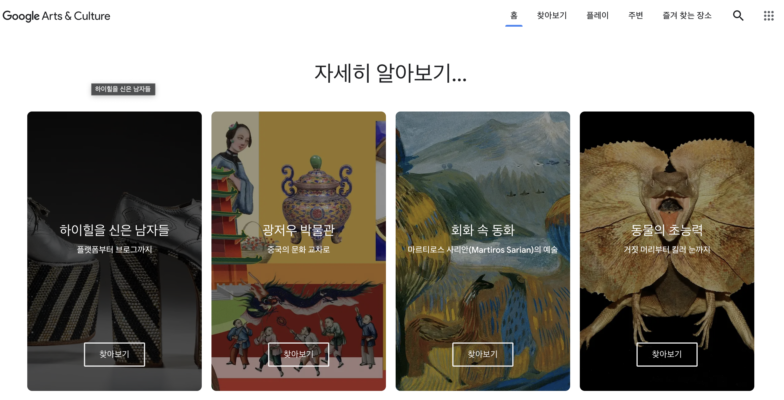 Google 아트 앤 컬처는 Google Cultural Institute와 제휴한 주요 박물관과 자료실 2,000여 곳의 콘텐츠 등 전 세계의 소중한 자료를 온라인으로 제공합니다.